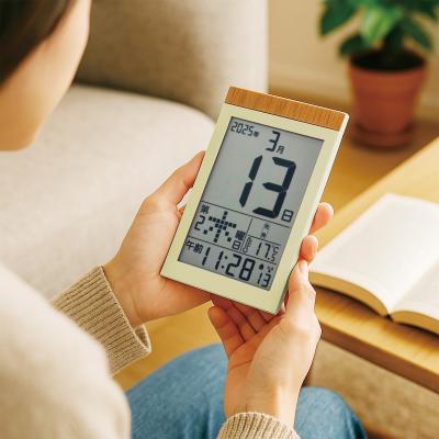 紙の日めくりをデジタルで表現した電波時計。今日は何日?がやさしく伝わる。電波で正確に、木目であたたかく。