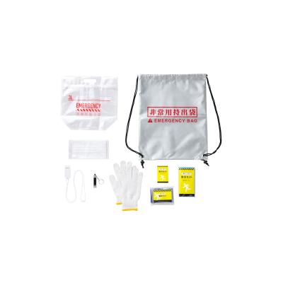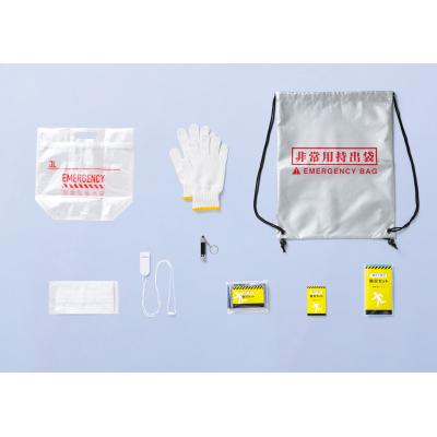 <セット内容> 持出袋×1 アルミシート×1 ホイッスル×1 マスク×1 防災のしおり×1 給水袋(3L)×1 ミニライト×1 携帯トイレ×1 軍手×1双 |