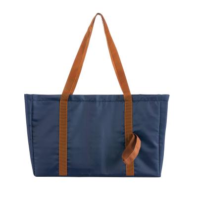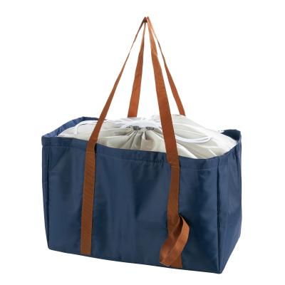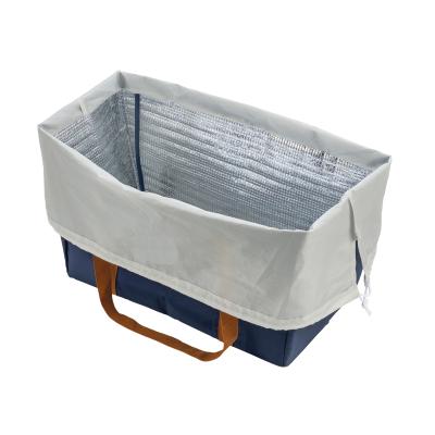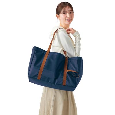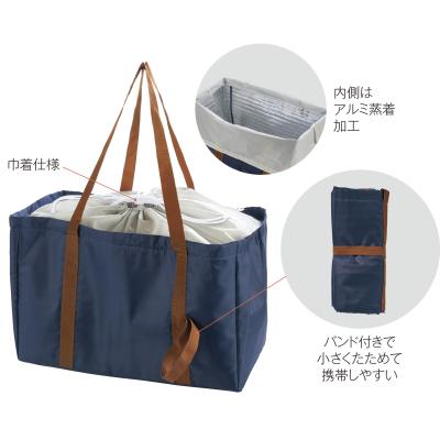 大容量、口元は巾着タイプで荷物が多くても安心。内側にアルミ蒸着加工を施した保冷温バッグです。肩掛けできる長めのハンドル付きで持ち運びやすく、使わない時は折りたたんでバンドで留めればコンパクトに収納可能。毎日の買い物からレジャーまで一年中活躍します。