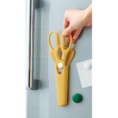 キッチン作業がはかどる万能はさみ。冷蔵庫にピタッとくっつけておけるマグネット付きのケースとセットです。