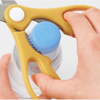 さわやかなグリーン/イエロー/ホワイトの本体カラーと、それぞれに合わせた色の化粧箱でご用意しています。通常のハサミの他、栓抜き、ペットボトルオープナーの機能付き。