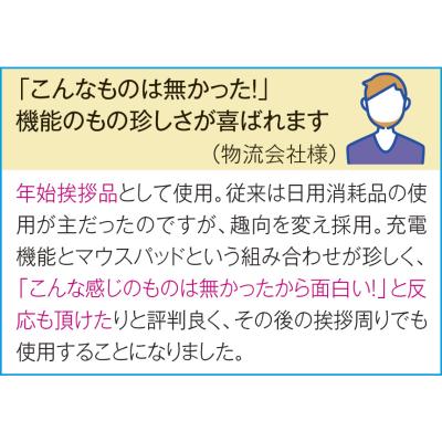 付属のケーブルを接続し、スマートフォンを置けば、PC操作をしながらでも、簡単に充電可能です。通電中は右上のLEDが青く点灯します。高級感のある仕上がりで、カラーはスタイリッシュなブラック。広く名入れができます。周年記念品やワンランク上のノベルティにおすすめです。