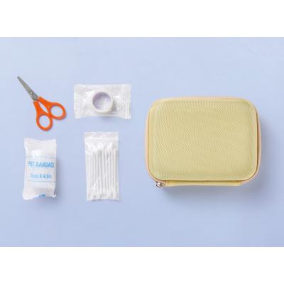 バッグに入れやすいスリムタイプのジッパーポーチに、応急処置に便利な包帯・綿棒・サージカルテープ・ハサミの4点をセット。伸縮性と通気性に優れたPBT(ポリブチレンテレフタレート)という素材で作られた包帯は関節などにもぴったりフィット。ケースには名入れ可能で、企業の備品やノベルティとしても活用できます。