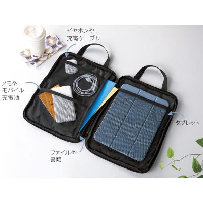 ランドセルなどに収まるスリム設計。内部はイヤホンや充電ケーブルを整理できるポケット、メモやモバイル充電器を入れられる収納スペース、さらにA4サイズのクリアファイルが収まるポケット付き。大きな収納部には最大14インチまでのノートPCやタブレットが収納可能!企業や学校関連の記念品としてもおすすめです。
