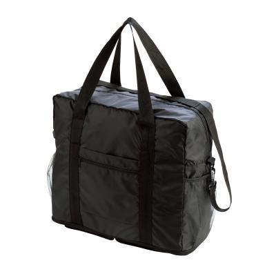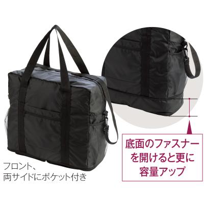 底面のファスナーを開けば収納力がアップし、急な荷物増加にも対応できる便利バッグ。広めのマチで整理しやすく、キャリーバッグのハンドルに固定できるベルト仕様で移動もスムーズ。折りたたむとコンパクトに持ち運べます。オールブラックのシンプルなデザインは男女問わず使いやすい仕様。名入れ対応も可能です。