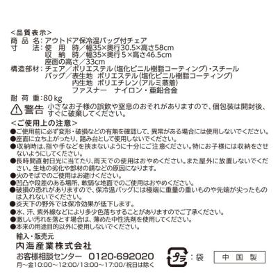 | 材質 | チェア部/ポリエステル(PVCコーティング)・スチール ボックス部/表生地/ポリエステル(PVCコーティング) 内生地/ポリエチレン(アルミ蒸着) ファスナー/ナイロン・亜鉛合金 |
