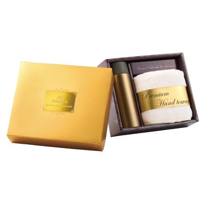 ハンドタオルにはゴールドの帯を巻いて、箱を開けた時の驚きまでもプレミアム。贈答品に最適な身蓋式の化粧箱がその価値をさらに高めます。