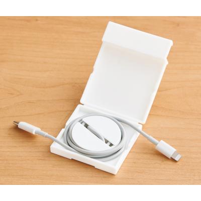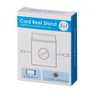 蓋を開けてケーブルを溝にセットし、ツマミを回すだけで巻き取ることができます。スマホスタンドとして縦横どちらの向きでも置くことが可能です。名入れ対応可能で、キャンペーン特典やアンケートのお礼品などに最適です。※USBケーブルは付属しておりません。