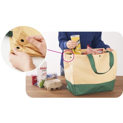 食材の買い出しからアウトドアでも使えるトートーバッグ。バッグ内側はアルミ蒸着加工が施されており、マチがしっかりとありレジカゴにセットしやすく、お買い物に最適です。マチのボタンを外せば容量もたっぷり!間口もボタンで留められ、持ち手は肩掛けでき、持ち運びに便利です。