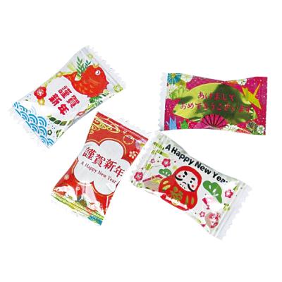 お正月柄のプレゼントボックスに迎春柄のキャンディを4個詰めたお手頃価格の商品です。