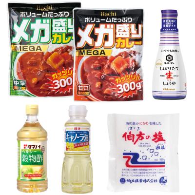 <セット内容> キッコーマン しぼりたて生しょうゆ200ml×5 理研 キャノーラ油265g×5 伯方塩業 伯方の塩100g×5 タマノイ ヘルシー穀物酢500ml×5 ハチ食品 メガ盛りカレー300g甘口×5 ハチ食品 メガ盛りカレー300g中辛×5 |