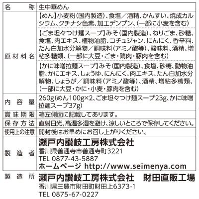 <セット内容> 麺100g×2 ごま坦々スープ23g×1 かに味噌スープ37g×1 お持ち帰りポリ袋同梱 |