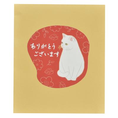 リラックスしたにゃんこが目印。 ありがとうございます/ほんの気持ちです/いつも感謝 の3種類のメッセージをご用意しています。(中身共通) それぞれ50個単位150個以上(以降50個単位)でお申込みいただけます。