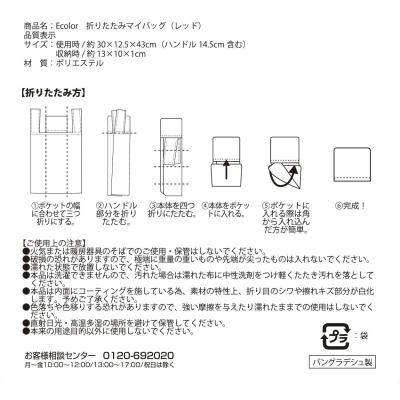 ちょっとしたお買い物に最適な携帯エコバッグです。折りたたみ式で内ポケットに収納でき、サイドマチがたっぷりあるので、大きな買い物も楽々です。軽量でメール便にも対応しています。Ecolorシリーズは環境(Environment)に配慮する社会で活躍するエコバッグです。