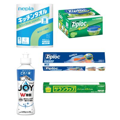 <セット内容> ・ネピア激吸収キッチンタオル2ロール(50カット)×9 ・P&G除菌ジョイコンパクト170ml(さわやか微香)×9 ・サランラップ(30cm×10m)×9 ・ジップロックフリーザーバッグM3枚×9 ・ジップロックスクリューロック300ml×9 |