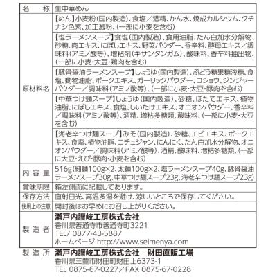 その他 <セット内容> 麺100g×4 塩ラーメンスープ×1 豚骨醤油ラーメンスープ×1 海老辛つけ麺スープ×1 中華つけ麺スープ×1