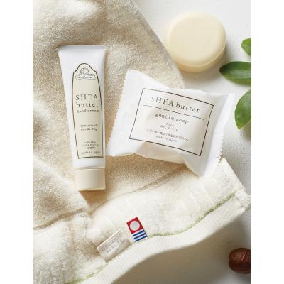 タオルは3年以上化学農案や肥料を使っていない農地で栽培され、 有機肥料を使用した人や環境にやさしいオーガニックコットン製。毛羽落ちを減らし、長持ちする甘燃りの糸でロングパイルに織り上げ、仕上げにシアバターを配合した、 しっとりとした肌触りの今治タオルです。乾燥しがちな手や指先に素早く馴染むシアバター配合の無香料ハンドクリームはしっとりとした手肌に導きます。