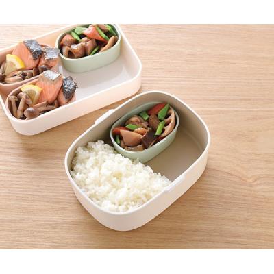 カップは丸のような四角のような形状で、丸型・角型どちらのお弁当箱にも詰めやすいです。 厚さ2mmでしっかりしているので、小鉢としてそのまま食卓にも出せます。 本体はスタッキングできるので場所を取らずに保存が可能です。