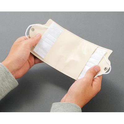 内側の仕切りにマスクを通してボタンで閉じて使用します。表側には大きく名入れスペースを取れます。厚さ約0.6cm/重量約45g(※必ず現品でご確認ください)でポストインに最適。