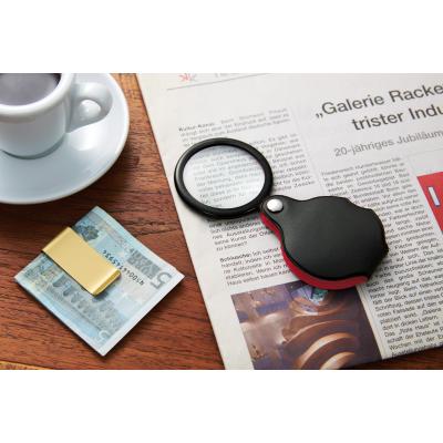 パッケージに入った金色のマネークリップ&出先で便利なポケットルーペのギフトセットです。