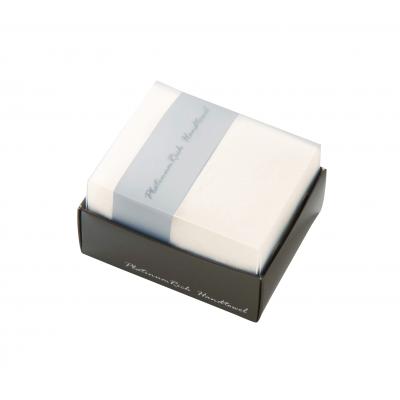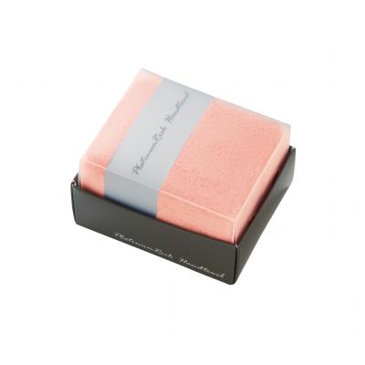 本体カラーはホワイトとピンクの二種類で、心地よい肌触りで毎日使いたくなるハンドタオルです。高級感のある化粧箱入りで、特別なお客様への贈答品やキャンペーン特典としても最適です。