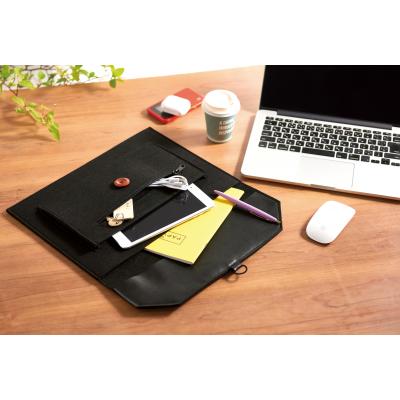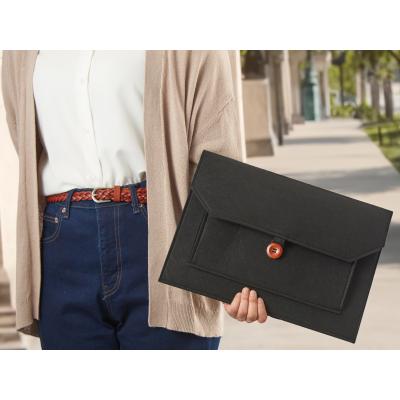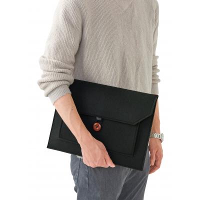 ビジネスバッグのインナーバッグとしても使いやすいスマートなシルエット。中央のウッドボタンがアクセントになっています。名入れも可能なので、企業の記念品や従業員向けの備品などで活用できます。