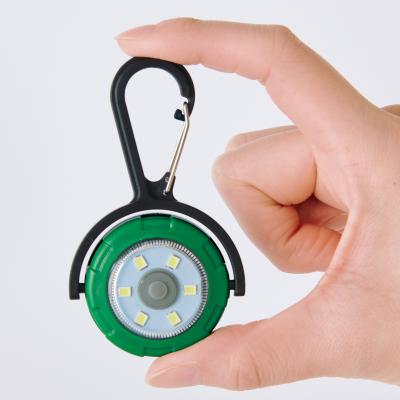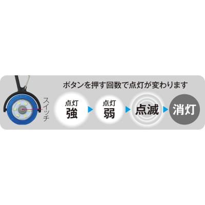 レジャーや防災シーンだけでなくお子様の通学カバンにも付けておきたい小型のライト。盤面が360°回転するのでフレキシブルに照らせます。ボタンを押すたびに3段階で切り替え可能(点灯強→点灯弱→点滅→消灯)。