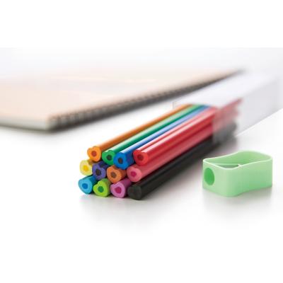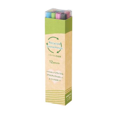 リサイクルポリスチレンを使用して作られた色鉛筆12色セット。環境にやさしい仕様で、エコ意識を楽しく学べるアイテムとしてもおすすめです。断面がハート型になっているユニークなデザイン。陳列しやすい透明感のあるクリアケース入りで持ち運びやすく、鉛筆削りも付属しています。