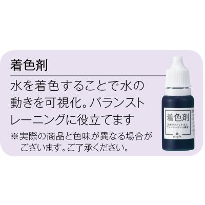 付属の着色剤を使えば、水の動きが可視化されより一層バランストレーニングに役立ちます。本体を膨らませるのに便利な足ふみポンプ付き。