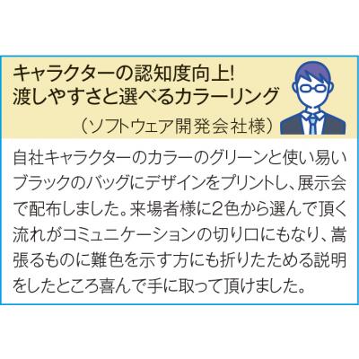 A4バッグは、軽量かつコンパクトで、使わない時はゴムバンドでまとめられ、携帯に便利です。展示会用バッグ、オープンキャンパスや会社説明会の参加記念品などにご活用ください。 Ecolorシリーズは環境(“E”nvironment)に配慮する社会で活躍するエコバッグです。