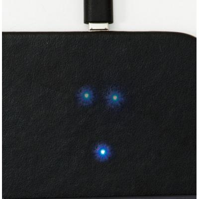 付属のケーブルを接続し、スマートフォンを置けば、PC操作をしながらでも、簡単に充電可能です。通電中は右上のLEDが青く点灯します。高級感のある仕上がりで、カラーはスタイリッシュなブラック。広く名入れができます。周年記念品やワンランク上のノベルティにおすすめです。