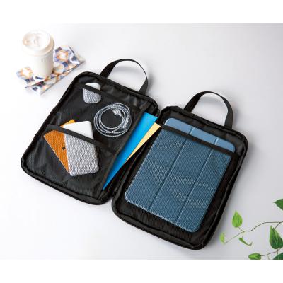 ランドセルなどに収まるスリム設計。内部はイヤホンや充電ケーブルを整理できるポケット、メモやモバイル充電器を入れられる収納スペース、さらにA4サイズのクリアファイルが収まるポケット付き。大きな収納部には最大14インチまでのノートPCやタブレットが収納可能!企業や学校関連の記念品としてもおすすめです。