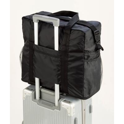 底面のファスナーを開けば収納力がアップし、急な荷物増加にも対応できる便利バッグ。広めのマチで整理しやすく、キャリーバッグのハンドルに固定できるベルト仕様で移動もスムーズ。折りたたむとコンパクトに持ち運べます。オールブラックのシンプルなデザインは男女問わず使いやすい仕様。名入れ対応も可能です。