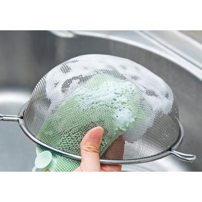 フライパンや食器はもちろん、細かいブラシ形状でザル洗いにも最適!使い終わったら裏面の吸盤でシンクにくっつけておけます。吊り下げ保管もOK。