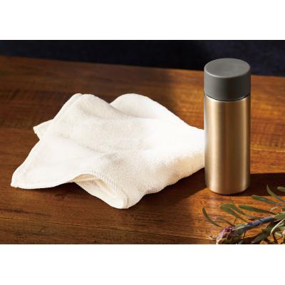 ゴールドパッケージに納めた、おでかけ時にセットで使えるミニボトルとハンドタオルのギフトセット。