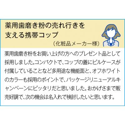 フタの裏側にはピルケースが付いており、薬やサプリメントを持ち運ぶのに便利です。専用のクリアポーチ入りで水濡れを防ぎ、持ち運びや衛生面でも便利です。幅広い年齢層に利用される商品で、病院や医療機関でのノベルティやドラッグストアでの粗品・景品として活用いただけます。コンパクトで実用的な贈り物としておすすめです。