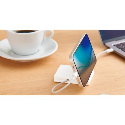 蓋を開けてケーブルを溝にセットし、ツマミを回すだけで巻き取ることができます。スマホスタンドとして縦横どちらの向きでも置くことが可能です。名入れ対応可能で、キャンペーン特典やアンケートのお礼品などに最適です。※USBケーブルは付属しておりません。