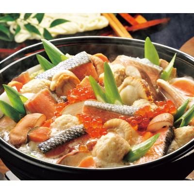 <セット内容> 鮭12切、鮭のアラ50g、ボイル帆立4個、とりごぼうつみれ・かにつみれ各15g×4、いくら醤油漬20g、うどん100g、鍋たれ20g×3 |
