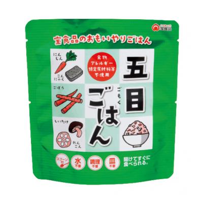 ニンジン、ごぼう、れんこん、椎茸とこんにゃくを加え、昆布やかつおの出汁、魚醤等の旨味をいかした旨味たっぷりの五目ごはんです。香川県産だいしもち(大麦)と国産発芽玄米を使用。スプーンが個別に添付されており、開封してすぐに食べられるごはんです。火や水が使えない状況下でも食べられますが、湯せん等で温めても美味しくお召し上がりいただけます。また食物アレルギー特定原材料等 不使用です。