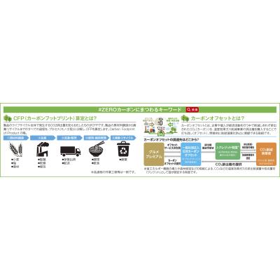 「#ZEROカーボン」とは、CFP(カーボンフットプリント)により算定した商品1個当りのCO2排出量0.83kg-CO2eに対してCO2排出権1kgを使いオフセット(打ち消し)し、CO2排出量実質ゼロ、つまりゼロカーボンに繋がる考え方です。化粧箱に「#ZEROカーボン」の仕組みがわかるQRコード付。
