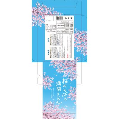 澄んだ青空に桜の花びらが舞い散る、華やかさとはかなさを表現したパッケージデザインが“エモい”桜そばとうどんのセット。賞味期限が500日と長いため、長期のイベントにもおすすめです。