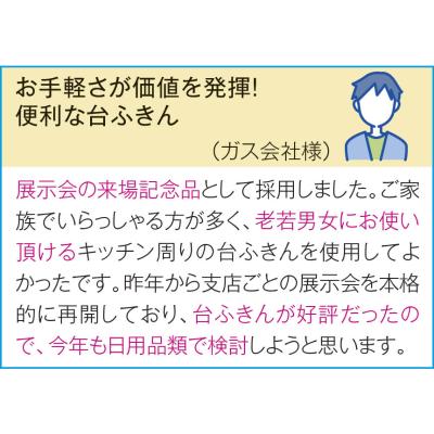 サッと取り出せて何度も使えるエコふきん。食器に、テーブルに、ガスコンロに、無駄なく使えます!使って洗って乾かして・・・。1枚を繰り返し使えるのでコストパフォーマンス抜群!テーブルに置いておけるかわいいパッケージ入り。ファミリー層の利用が多いカーディーラーや住宅展示場での来店・来場記念品にご活用ください。