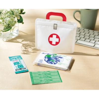 | 本体サイズ | ジッパーポーチ/13.8×13.8cm 水に流せるペーパー8W/11×1×8cm アルコール除菌ジェル1.5ml/4×9.8cm 絆創膏5枚/6.5×8.6cm |