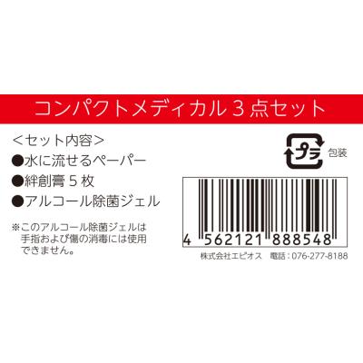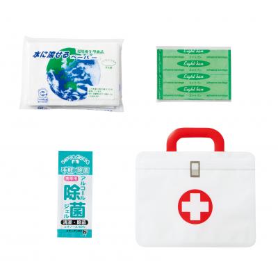 水に流せるペーパーや絆創膏、除菌ジェルをコンパクトにまとめた応急3点セットです。