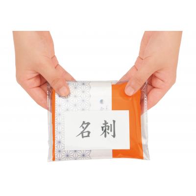 肩掛けができる大きめサイズで、内ポケットに折り畳んでコンパクトに携帯でき、名刺やショップカードを差し込めるポケットが付いており、効果的なアピールが可能。名刺ポケット付き個包装エコバッグは贈り物やノベルティとして大人気。和柄プリントのパッケージはインバウンド向けノベルティやシニア向け記念品としても最適です。