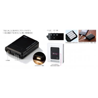 名入れが際立つブラックボディのモバイルバッテリー。停電時も心強い乾電池式。