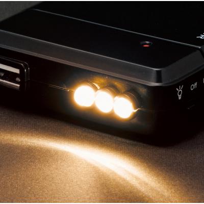 単3型電池4本で充電可能で、LEDライトも備えており、緊急時に手元を照らすのに便利です。一般的なモバイルバッテリーはそれ自体の充電が必要ですが、乾電池式は急な停電時にも安心。また、窓空きパッケージは名入れが映え、防災グッズとしてだけでなく企業や店舗のオリジナルノベルティや販促品として活用できます。