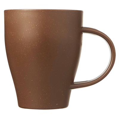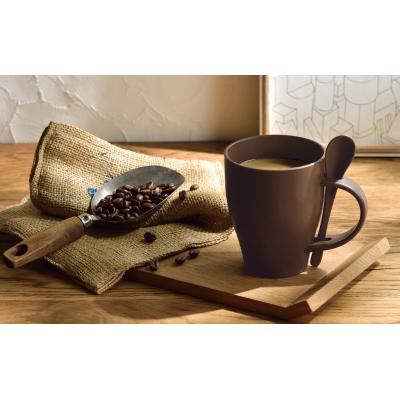 コーヒーのカラーと質感がオシャレな、豆かすを再利用したスプーン付きエコマグカップ。