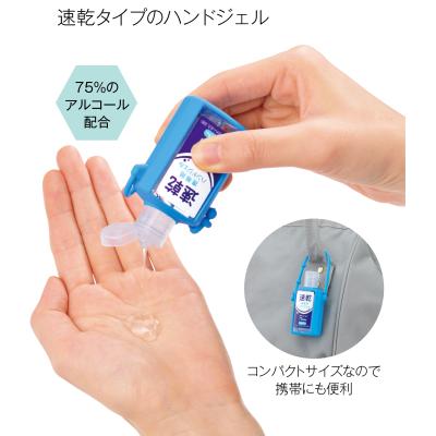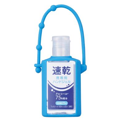速乾携帯用ハンドジェル29mlは、アルコール含有率75%。シリコーンストラップ付きの片ハンドル仕様でバッグやベルトに下げやすく、持ち運びも便利。ジェルはベタつかずサラッとした使い心地で、幅広い年齢層に人気です。