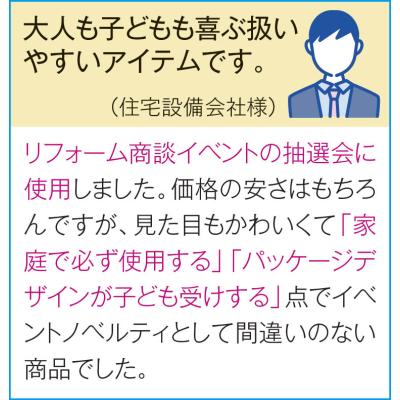 癒し系の動物イラストが可愛いトイレットペーパーです。パンダの親子を印刷した包装紙で、白無地のトイレットペーパーを1個ずつ包んでいます。イベント会場で積み上げると、インパクトがあるディスプレイとして映えます。季節を問わず、老若男女問わず、様々なイベントでの景品、来店者プレゼントなどのばらまき用販促グッズとして最適です。